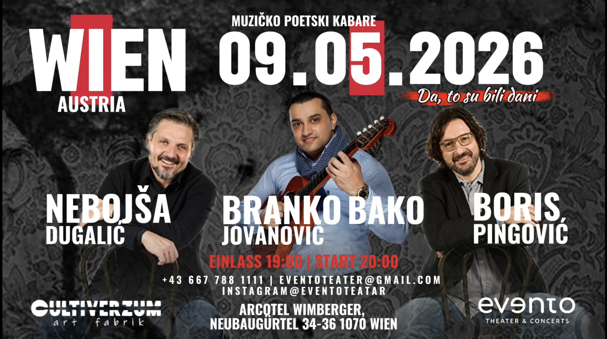Autori i izvođači ovog projekta su istaknuti dramski umetnici Nebojša Dugalić i Boris Pingović, čija energija, harizma i višedecenijsko iskustvo na sceni garantuju veče ispunjeno emocijama, humorom i vrhunskom umetnošću. Poseban segment večeri donosi i nastup vrhunskog muzičara Branka Bake Jovanovića, virtuoz na tamburi koji tradiciju pretvara u avangardu.
