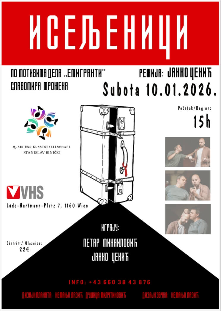 Predstava “ISELJENICI” po motivima komada”EMIGRANTI” Slavomira Mrožeka, bavi se životom naših ljudi, gastarbajtera и Beču. Radnja komada dešava se u večeri dočeka Nove godine. Junaci ove duhovite duo drame su radnik i intelektualac. O kojoj temi da razgovaraju, misle potpuno drugačije što dovodi do brojnih sukoba i komičnih situacija. Takođe, jedna od tema ove predstave jeste: Šta je to sloboda? Da li je sloboda u novcu?